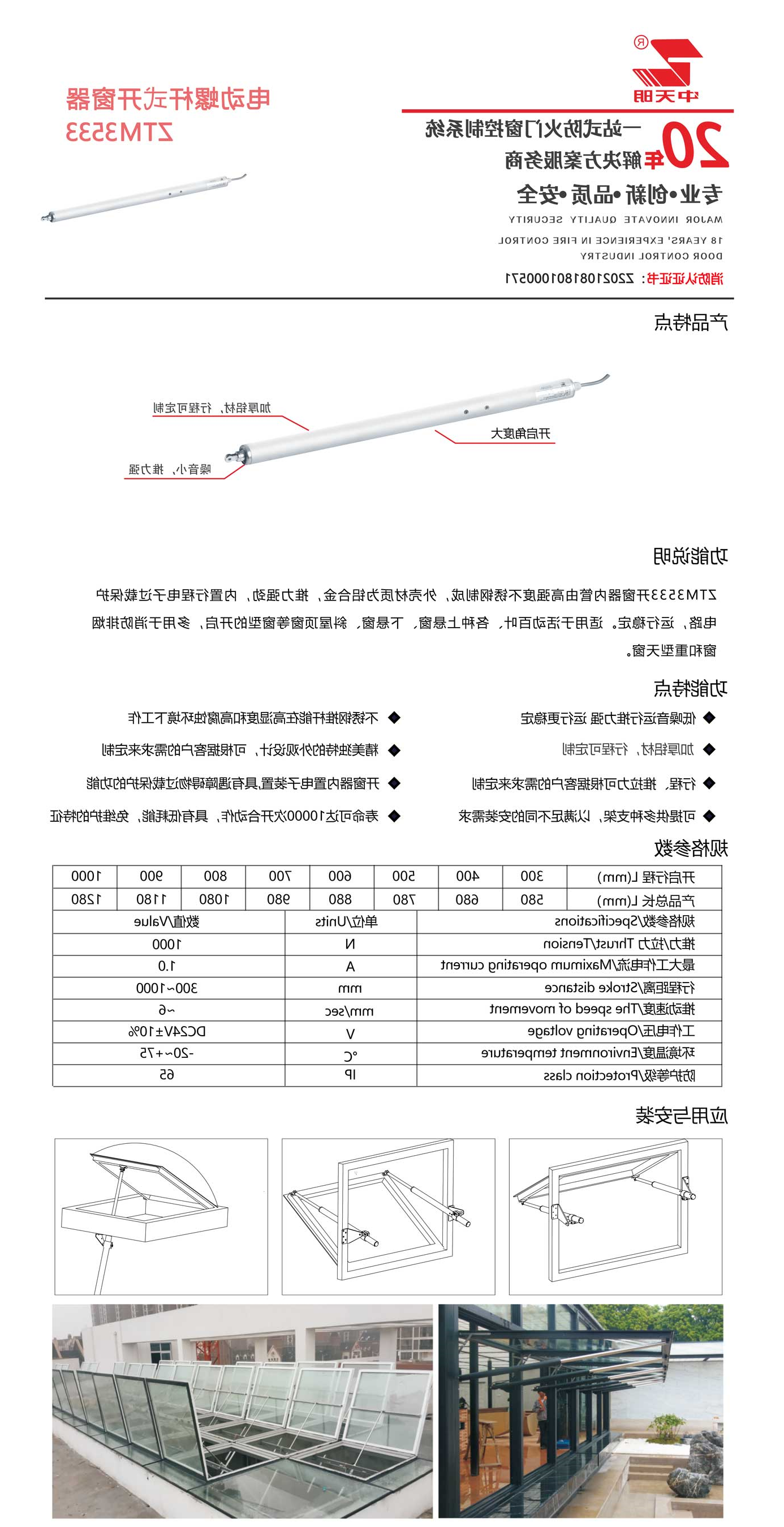 螺杆式电动开窗器,又名螺杆开窗器,螺杆机。内管由高强度不锈钢制成,外壳材质为铝合金,推力强劲,内置行程电子过载保护电路,运行稳定。适用于活动百叶、各种上悬窗、下悬窗、斜屋顶窗等窗型的开启,多用于消防排烟窗和重型天窗。