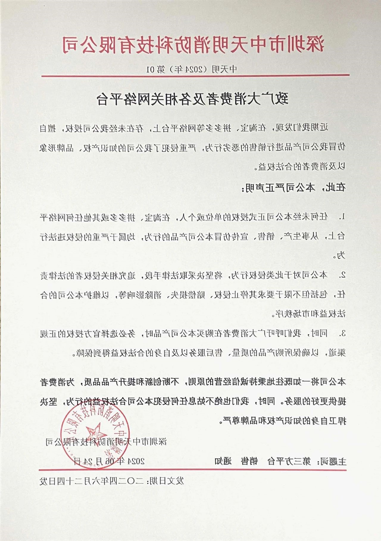 3. 同时,我们呼吁广大消费者在购买本公司产品时,务必选择官方授权的正规渠道,以确保所购产品的质量、售后服务以及自身的合法权益得到保障。